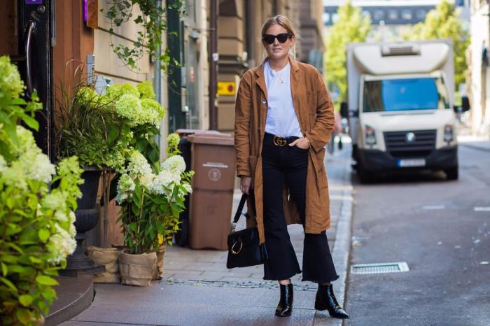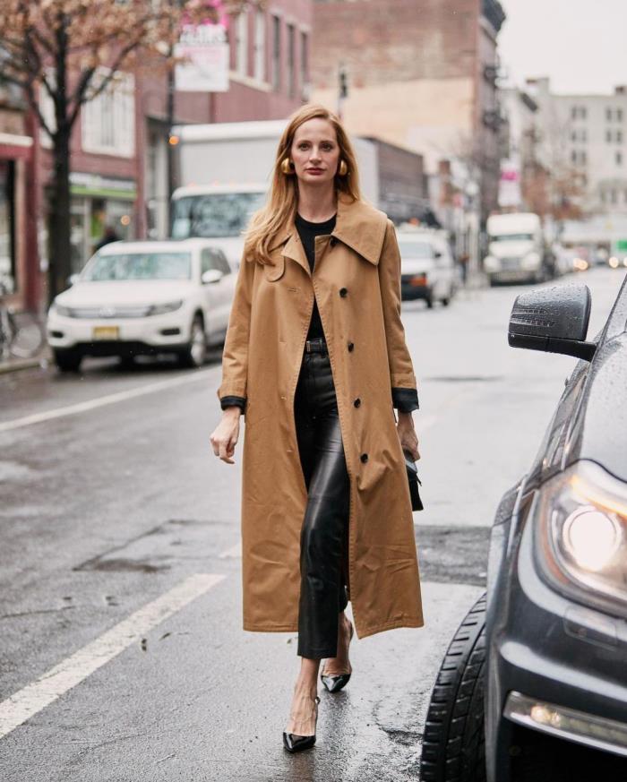 风衣在与针织衫搭配时,我们要根据针织衫的颜色来调整风衣的颜色,卡其色的风衣百搭,可以搭配黑色的针织内搭,一条修身的牛仔裤,整个颜色搭配很协调,休闲又随性。