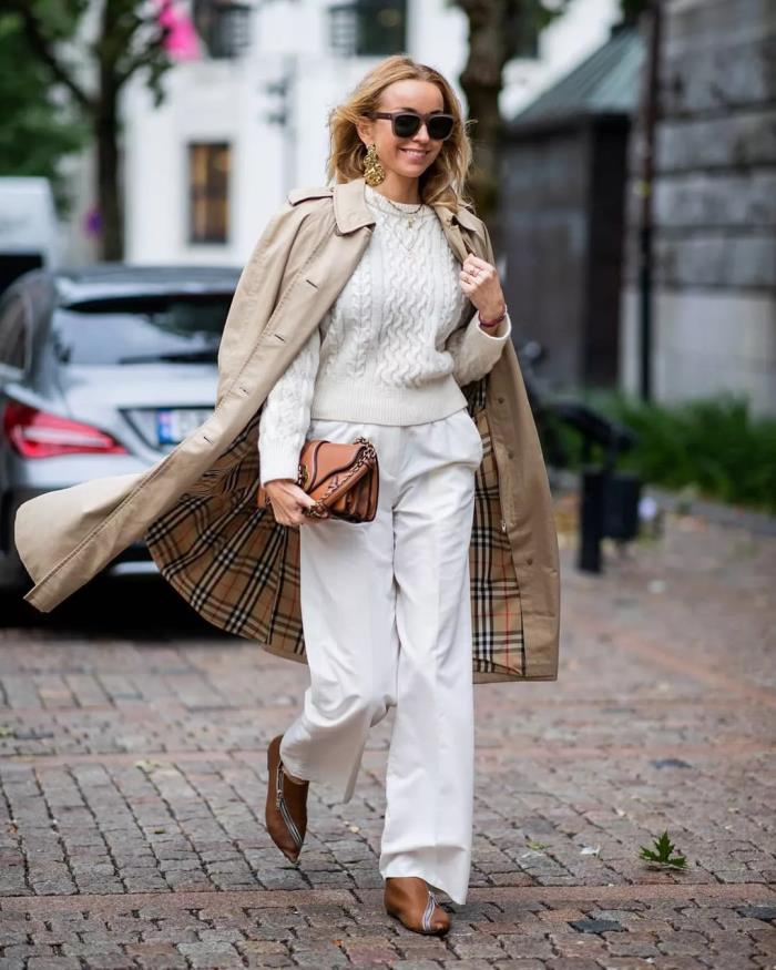 除了风衣的颜色和版型以外,风衣在和针织衫搭配时,也要注意一些细节。