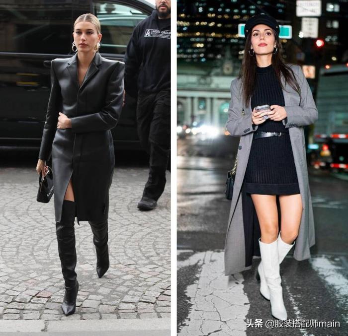 日常搭配的话,靴子不用太花哨,黑白纯色就非常百搭好驾驭,哪怕组成一身中性色都不会觉得枯燥,海莉和维多利亚·贾斯蒂斯两位模特都是这么搭的。