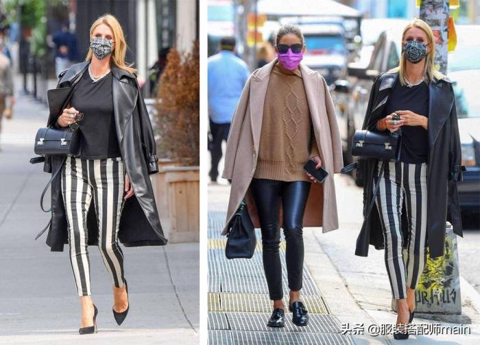 基础款高跟鞋比较正式,再配上休闲的风衣,上班通勤都能搭。鞋子尖尖的鞋头也能修饰脚型显脚瘦,妮基·希尔顿脚踩高跟鞋,整体感觉是不是要比穿平底鞋的奥利维亚·巴勒莫(右图左一)好很多~