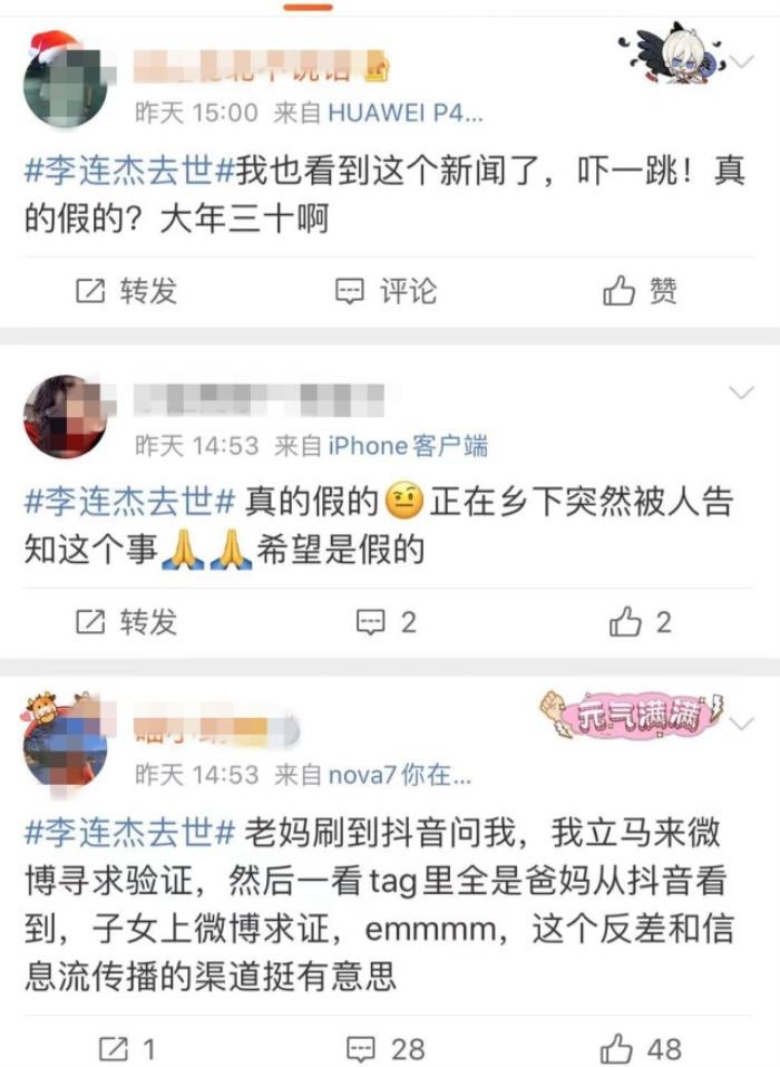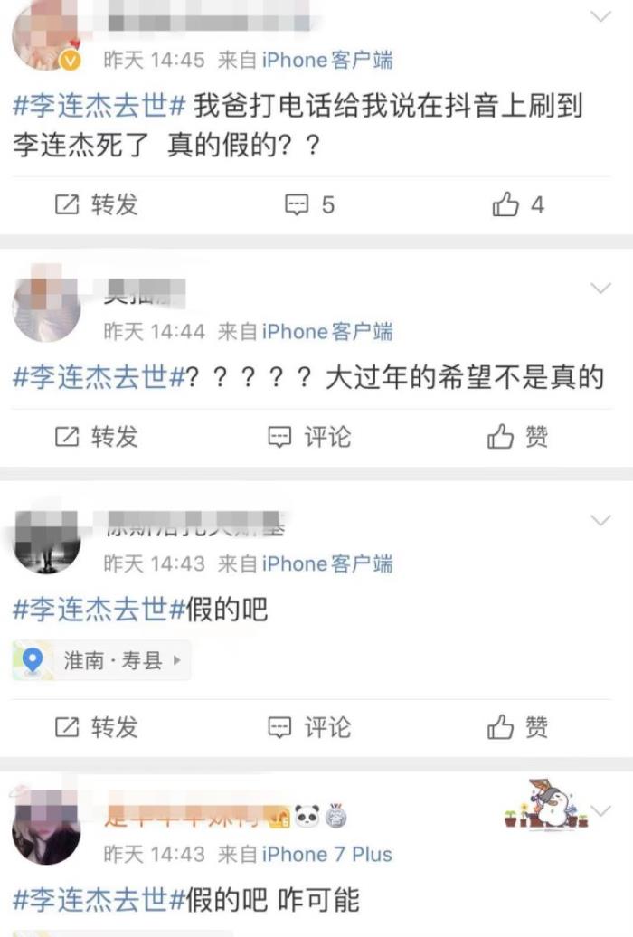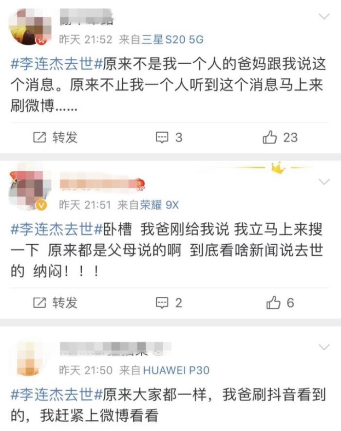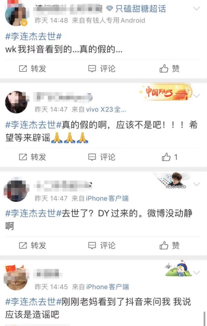 结果,大家都看到了“李连杰去世”的话题,里面全部都是这样的留言,看来谣言传播的轨迹很清晰: