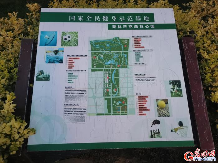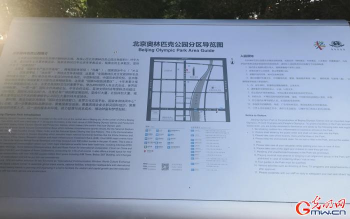 6月21日,黄昏,北京奥林匹克公园分区导览图。(张晓荣 摄)