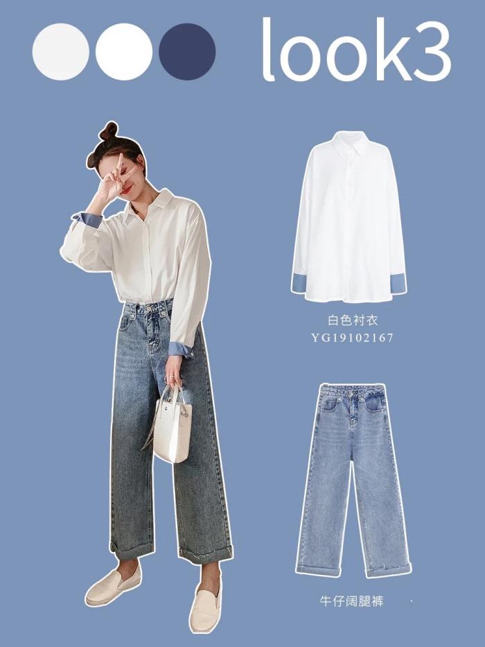 0白色衬衣+牛仔阔腿裤,白衬衣清爽大方,牛仔阔腿裤青春洋溢,这样的搭配非常的减龄。尤其是这种娃娃领的白衬衣,点缀了小V领的修饰,露出精致的锁骨,更加甜美时尚。高腰的阔腿裤,将衬衣塞进去,也是非常的显高。对于1米5小个子来讲,更加友好。
