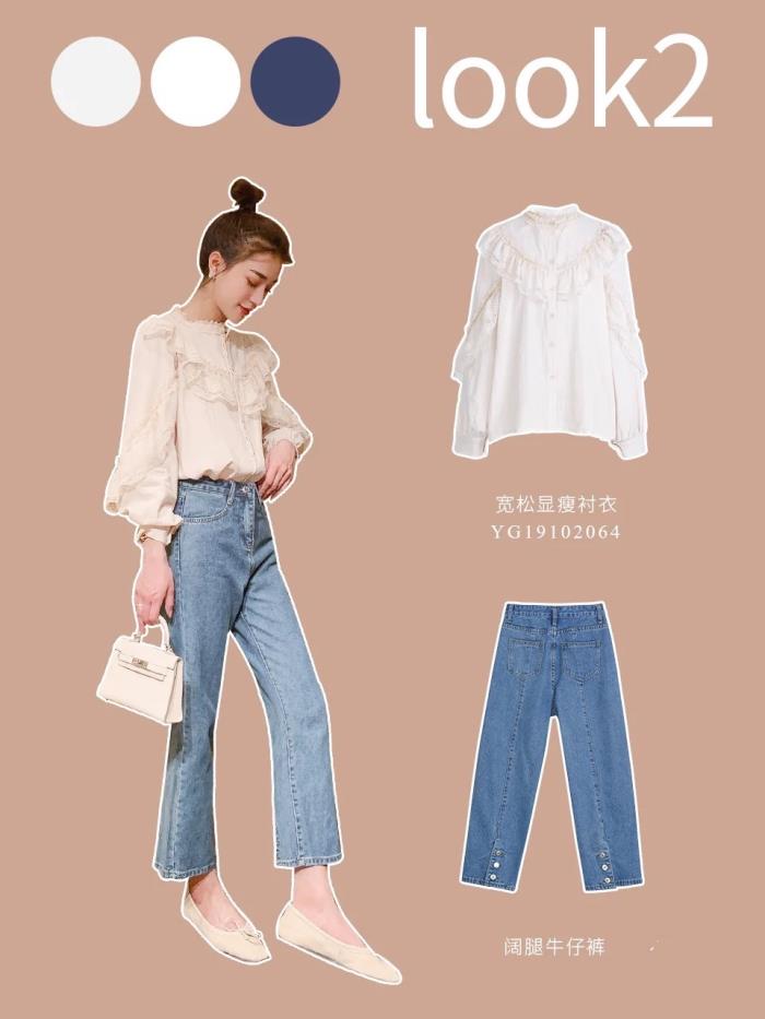 0宽松显瘦衬衣+牛仔阔腿裤,牛仔阔腿裤的风格,更加减龄时髦一些。高腰的款式与衬衫的搭配,更加显高。这种宽松的衬衣,点缀了蕾丝造型的修饰,也是多了几分唯美浪漫美女的气质,尤其是会更加适合一些可可爱爱的姑娘。