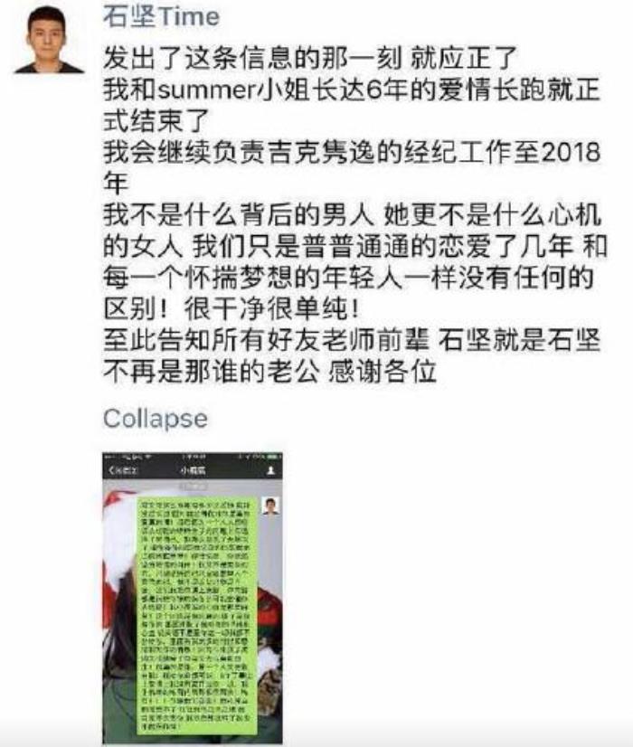这位名叫石坚的男子正是吉克隽逸曾经相恋六年的男友,现在的他已经结婚生子,在和吉克隽逸分手后,男方闪婚有了儿子,或许这样的事实在吉克隽逸看来是残忍的,也会让大众认为石坚是个渣男,但从双方的聊天来看,只能说追求不同,没有办法,男方追求婚姻和家庭,而女方在事业上升期,要的是自由,这就意味着他们不可能达成和解,只能分手。