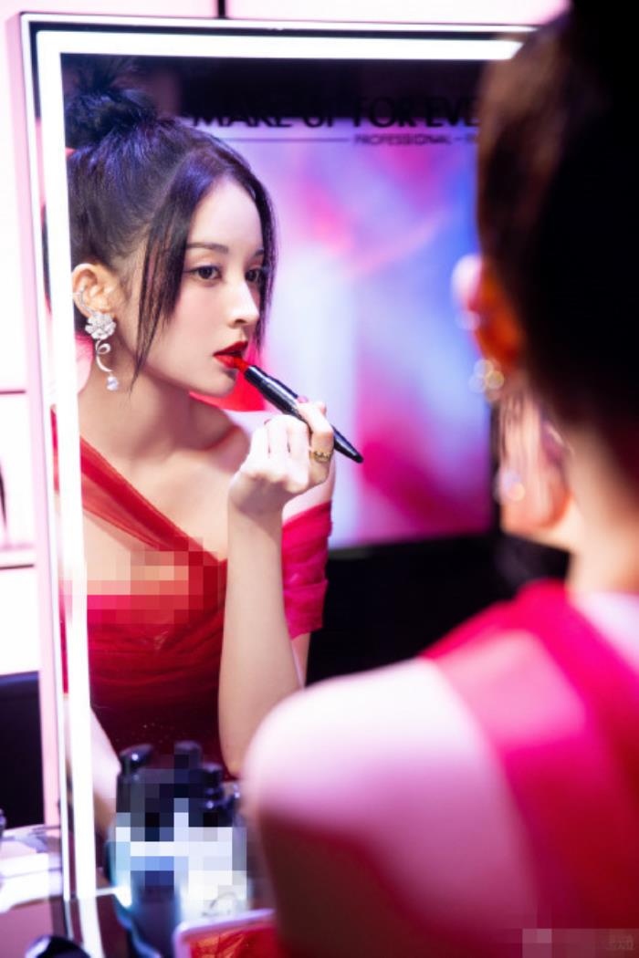 古力娜扎活动现场补妆,化妆镜子里,古力娜扎正在涂抹口红。昨日迪丽热巴被曝活动现场照镜子美照,长相精致美艳。而古力娜扎镜子下,有同样的美艳。