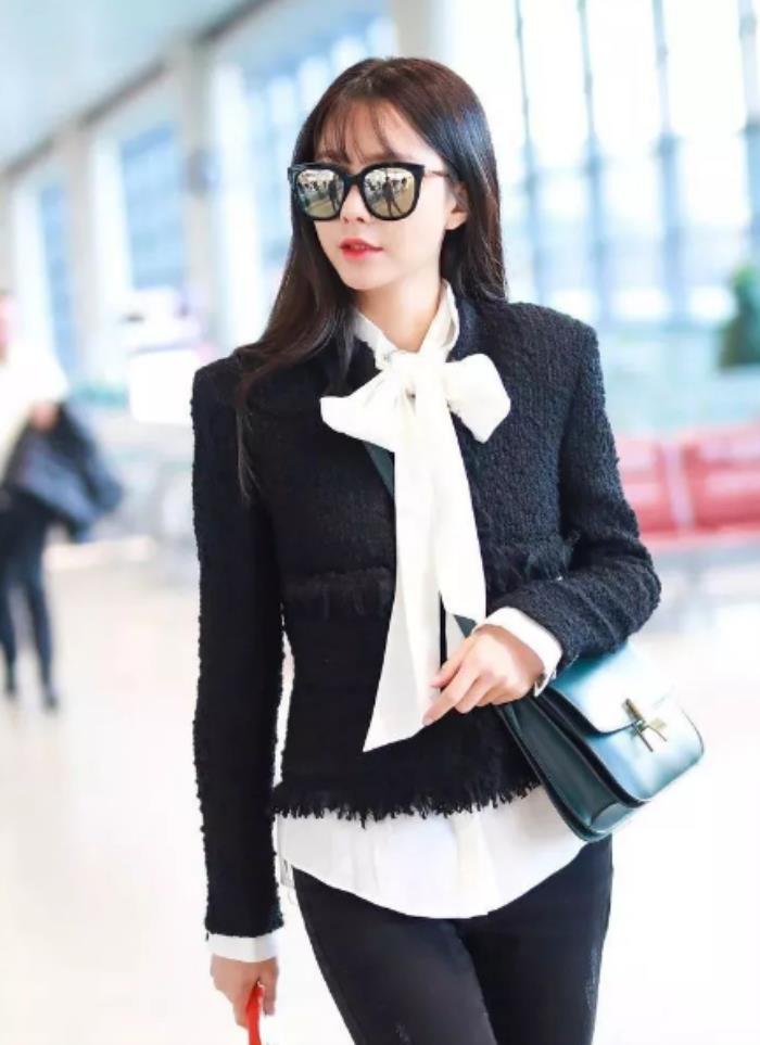当然不将衬衣衣摆扎进裤腰中也可以,不妨像沈梦辰一样搭配一款黑色淑女小外套。黑色具有包容性,可以搭配多重颜色的衬衣,系好的蝴蝶结置于外套外,满满优雅淑女范儿。