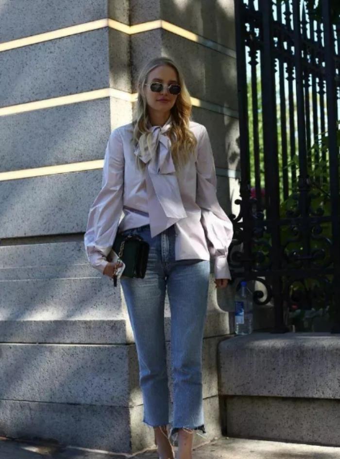先来一个错误示范,宽松的衬衣在腰间的褶皱衬得身材臃肿,从而显得领口的蝴蝶结十分累赘。所以系带衬衣很优雅,但是也不经不起随便穿呀!