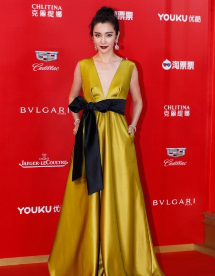 李冰冰的这身连衣裙则是将蝴蝶结系于腰间,不仅能够通过蝴蝶结带子勾勒腰部曲线,同时也能重新划分上下身材比例,更显腿部修长。而内敛的黑色和张扬的金色结合在一起,也非常的华丽贵气。