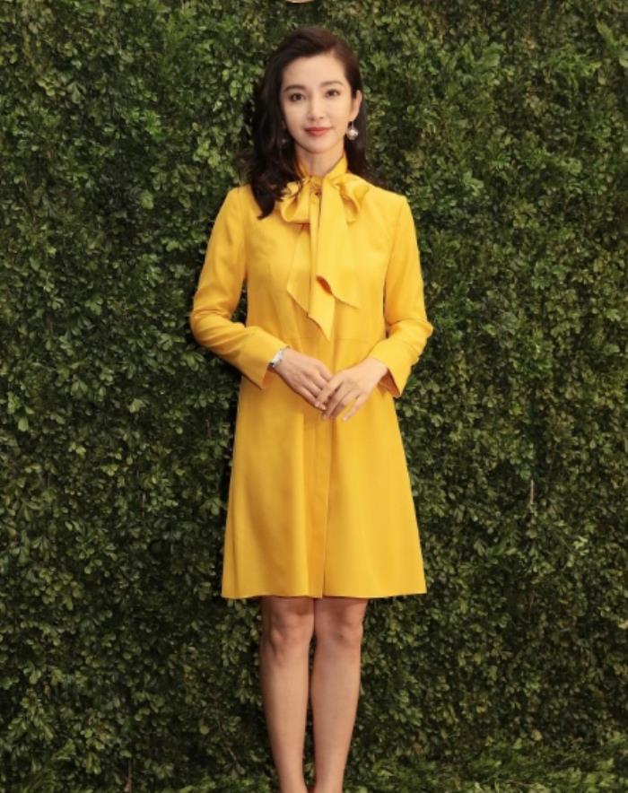 鲜艳的柠檬黄连衣裙,单是颜色就让人忍不住侧目,不过李冰冰身着的这身衬衣连衣裙在剪裁上还是比较简单,唯一的点缀就是脖子间系成的蝴蝶结,优雅而知性。