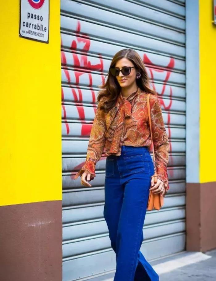印花系结衬衣搭配蓝色格纹半身裙,这身造型就比较接地气儿。素净却繁密的印花为整个造型注入了一丝生机,不过同花色的蝴蝶结就不太明显了,好在随风飘扬时,能来窥见一二。所以选择了蝴蝶结,最好是不要选择这种花色较密的款式。