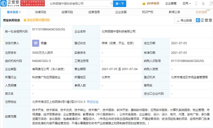 企查查App显示,7月5日,北京顺捷中恒科技有限公司成立,法定代表人为银鑫,注册资本5000万元人民币,经营范围包含:软件开发;计算机系统服务;经济贸易咨询;企业管理咨询;教育咨询等。