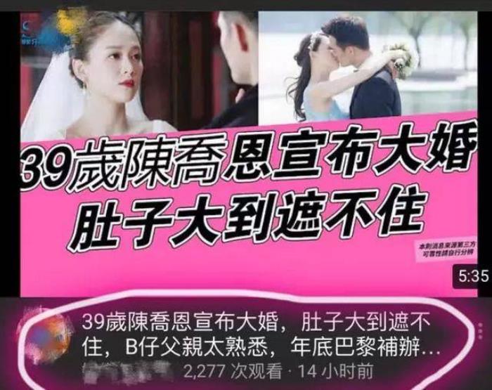 之后,两人一直有绯闻传出,还有消息传出两人已经领证结婚,更有媒体报道,称:“39岁陈乔恩宣布大婚,肚子大到遮不住”。