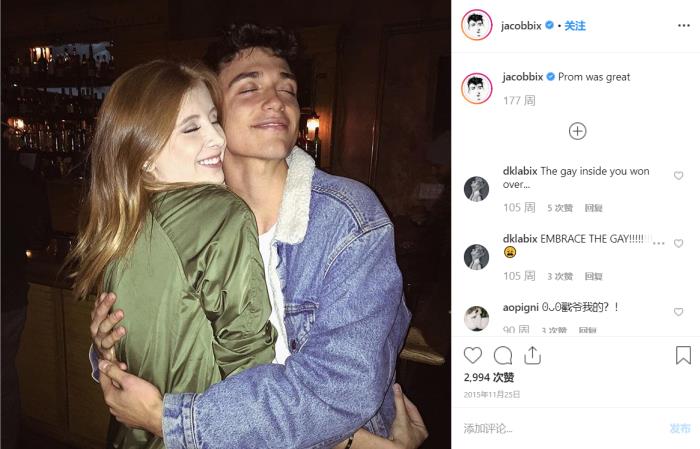 更有趣的是,他在2015年的时候还有和女生非常亲密的图。留言中有人猜测:所以Jacob以前是直的?被戳爷掰弯了吗?