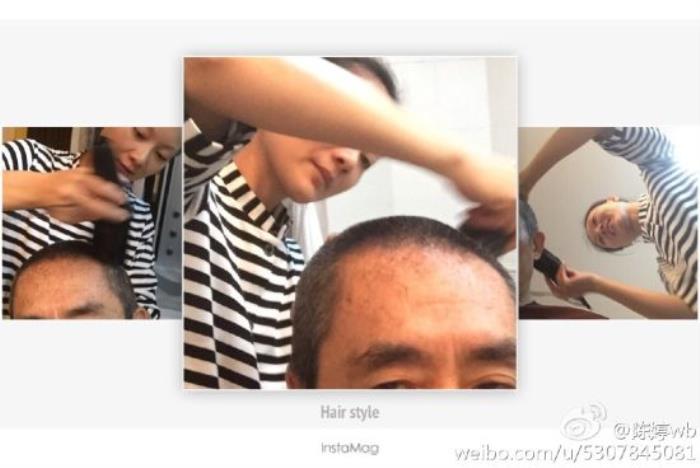 线索3,看下图,是张艺谋的小妻子在给他理发,她说她已经为他理了十几年。这动作让你想起了什么,是的,就是妈妈小时候给我们理发的回忆。