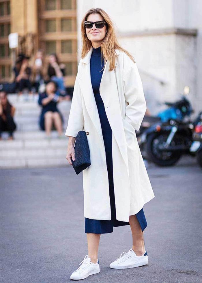 对于深蓝色,用大面积的白色来压制,低调又显优雅。而蓝色裙装与蓝色手包,白色大衣与白色鞋子,相互点缀,更加高级,全身只有两种颜色,看上去更大气又质感。