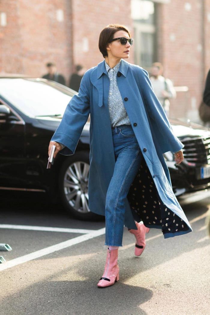 一身蓝时,用两种不同的材质,营造层次差异,这种差异变化让整体的搭配更时髦。