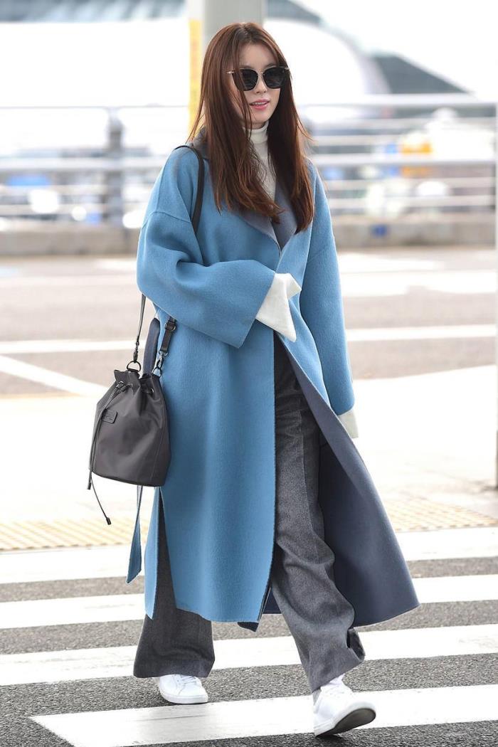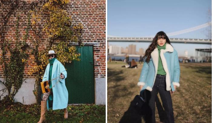 蓝色本身的存在感强,大面积的深色或是过于鲜艳,虽然显白但也很难驾驭,浅淡一点的蓝色会更适合,尤其是作外套,显气质又显白。