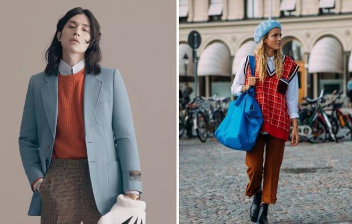 蓝色配灰色,温暖中透着一丝宁静,简洁又不失优雅。选择灰色做内搭,灰色卫衣更显休闲,灰色毛衣更显知性。而灰色与蓝色保持在同一明度上,整体搭配上会显得比较质感。如果两种颜色色差比较大,可以用白色来做过渡。