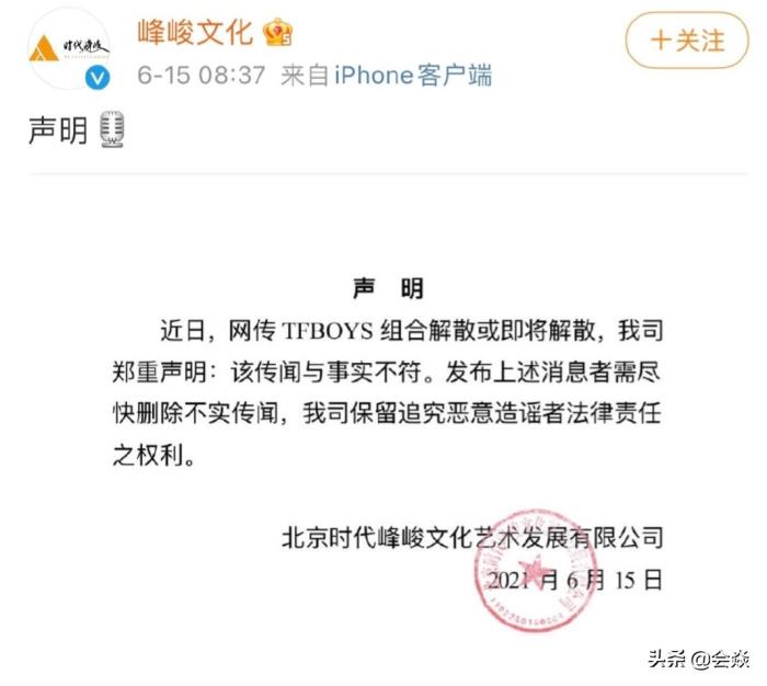 不过,面对网友的解散传闻,时代峰峻否认TFBOYS解散,及时进行了辟谣。十年之约,怎么可能说解散就解散呢?
