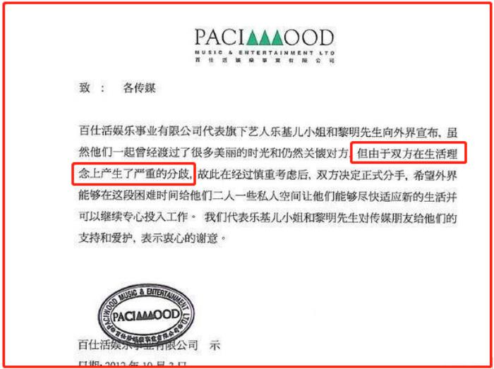 在当时黎明的离婚声明中能看出,离婚原因是生活理念有分歧,最后才走到这样的结局。
