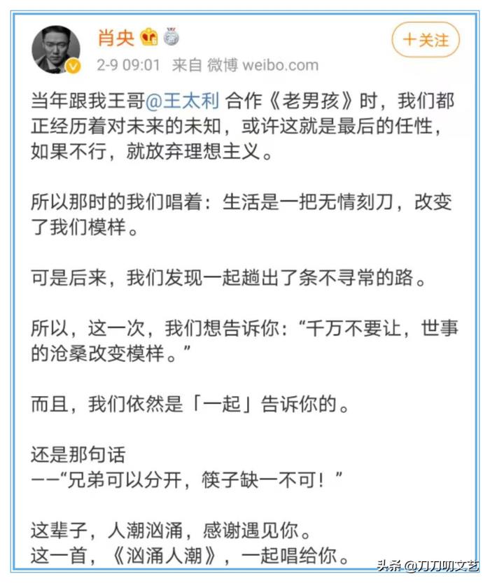 如今,肖央和王太利虽然专注不同的领域,但老男孩仍是追梦人,他们久违合体,打破“解散”“分道扬镳”的种种传闻,为《人潮汹涌》演唱了理想推广曲:《汹涌人潮》。