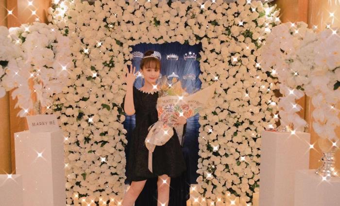 地点选在室内,身后是白色玫瑰组成的花墙,中间镶嵌着一个满是皇冠的展柜,桌上还摆放着一个像星空一般的蛋糕,顶上点缀着许多气球。