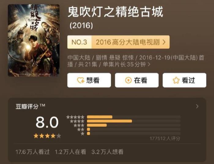 这版被誉为目前为止最好的一版鬼吹灯,演技、特效、剧情、节奏,除了短,只有18集外,没其他毛病了。