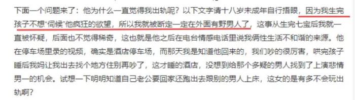 接着何洁还爆出了一些隐私,她透露当时她刚生完孩子,没有心思“伺候”赫子铭疯狂的欲望,所以赫子铭凭借这一点断定自己在外面有野男人,还打电话到电台,哭诉性生活不和谐。