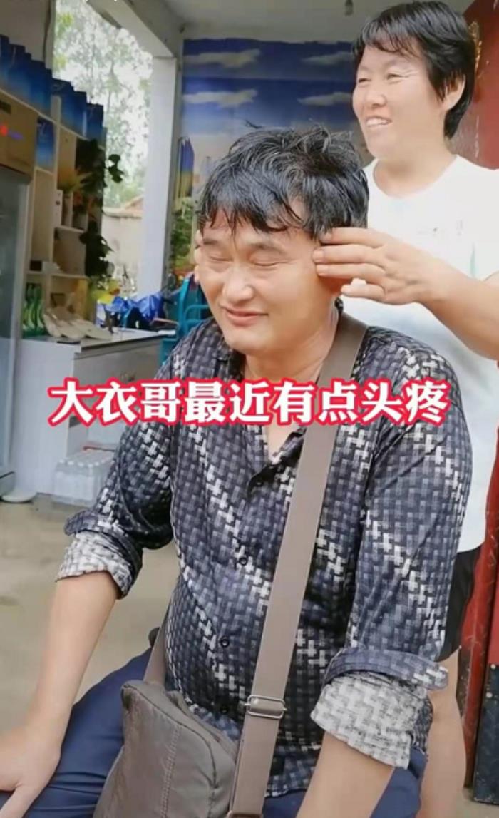 视频中,大衣哥身着接地气的花纹衬衫,背一个使用痕迹明显的咖啡色斜挎包,正坐在凳子上,微微眯着眼,表情非常放松。站在其后方的亲戚正为大衣哥按摩头部,视频还配文“大衣哥最近有点头疼”。