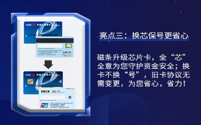 借记卡换卡不换号业务在以前的旧模式下,需要客户本人携带到期借记卡、证件等到网点办理,涉及申请、输密等多个环节,且换卡申请、新卡启用分别需要客户到网点各跑一次,客户每次往返网点路途及办结业务也需要花费时间,遇到疫情等特殊情况可能还不能办理。而新模式下,不仅大幅节约客户每次跑工行的路途往返、排队、办理时间,而且由于采取后台集约处理方式,大大缩短了办理至启用的整个时长,客户一次都不跑就可以实现线上快捷办理。
