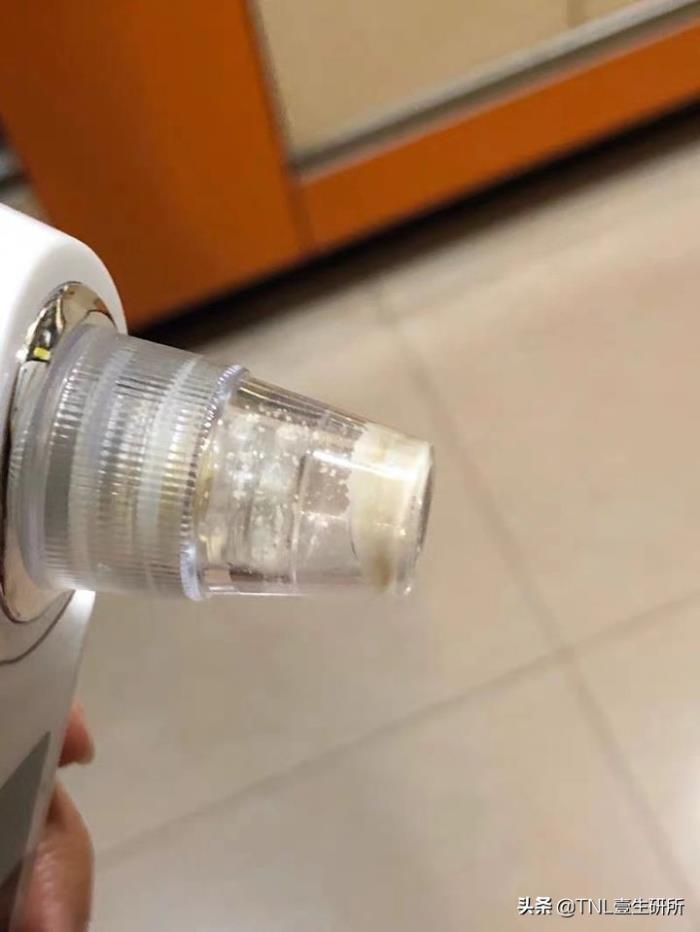 黑头浮出以后,是非常容易被清理掉的,如果你是去美容院做小气泡,美容师这时候会用黑头仪进行吸走,黑头仪就是真空负压笔,像吸尘器一样具有吸附性,能吸走脏污:
