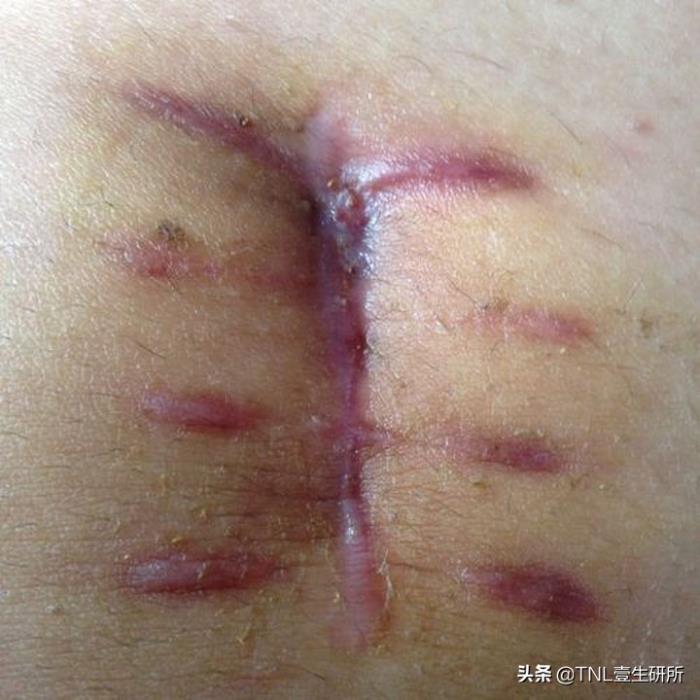 毛孔受伤以后,和普通刀伤是一样的,再次愈合就会增生留疤发黑,看一下普通刀伤的样子: