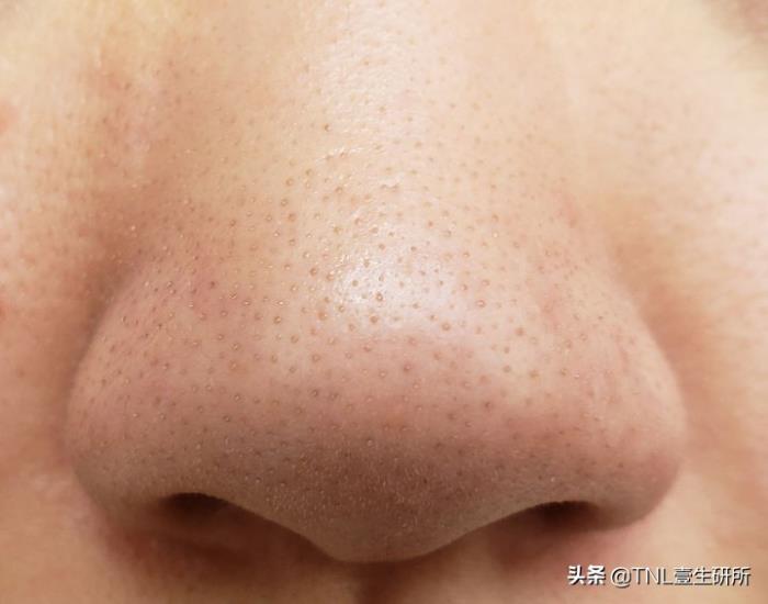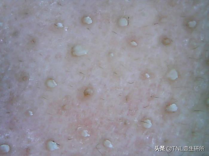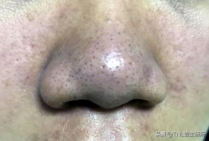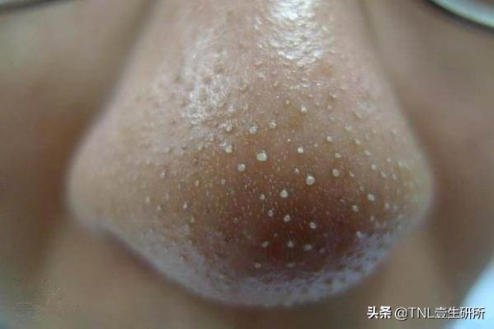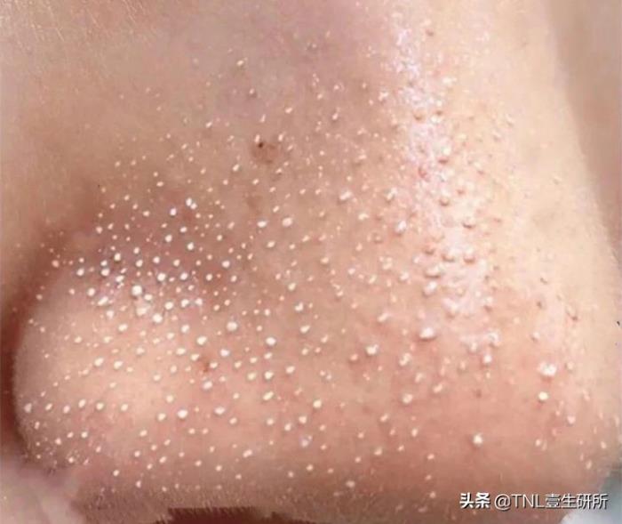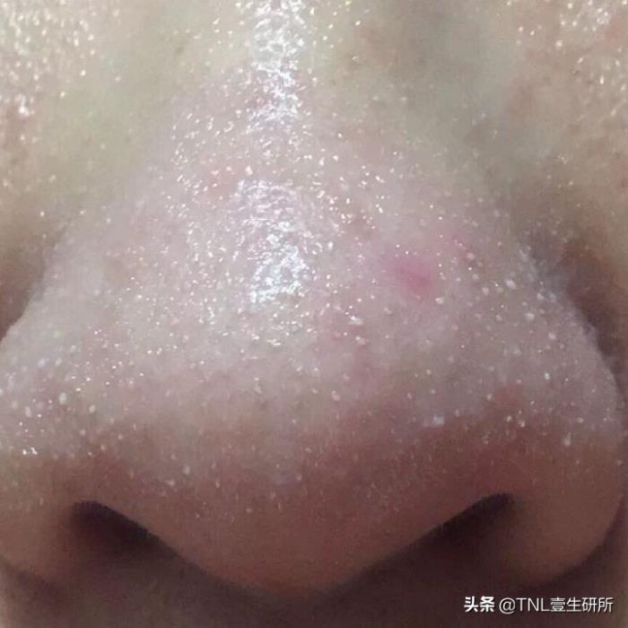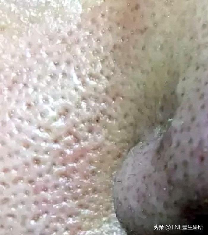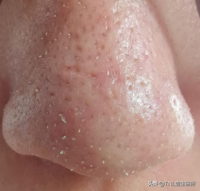 仔细看,可以清楚的看到毛孔里一颗一颗的白头,也就是油脂凝结变硬的油脂角栓: