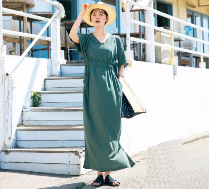 一些微胖人士,不妨选择宽松版型、收缩色连衣裙,通过营造大V领+收腰+露手臂小腿三个细节,将显瘦进行到底。