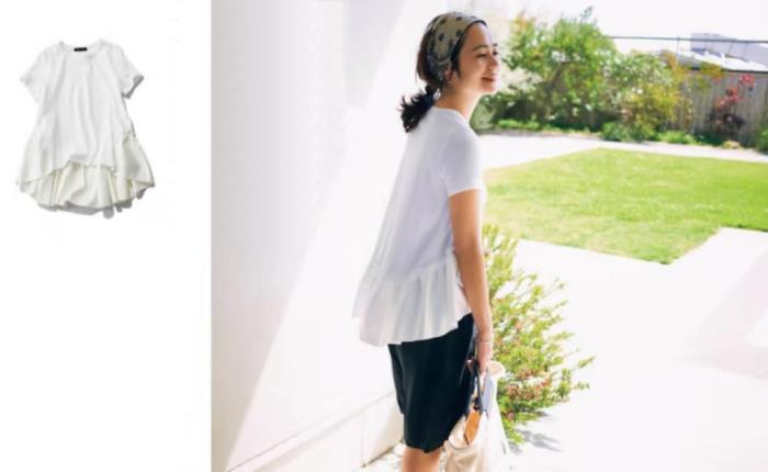 非常巧妙的前短后长,改变着上衣下摆的线条走向,在臀部形成飘逸的波浪曲线,既遮挡还能分散对腰腹臀的注意力,可谓一箭数雕。