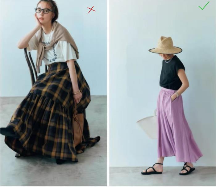 半身裙保持九分长度,面料轻透、有垂感,在打造优雅风方面最为合适。下图中的2套搭配,左边格纹裙又沉重又繁琐,远没有紫色半身裙的大气和浪漫。