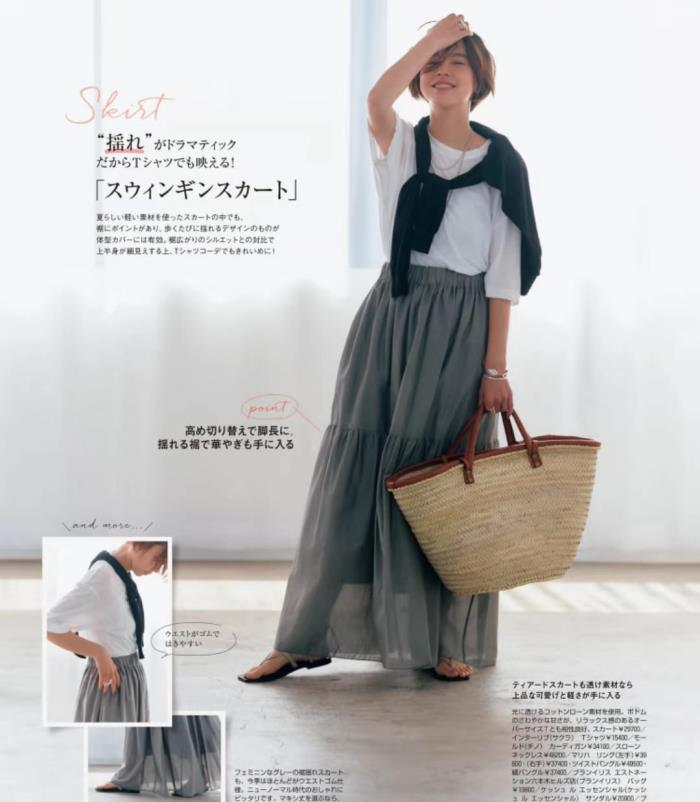 长裙,特别是大摆拖地时,轻透的面料可以弱化拖沓,带来欢快和凉爽。尽管不太利于小个子的显高,但对于高个子想要显瘦却是最佳的调和。
