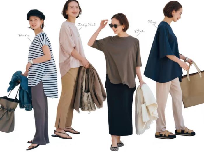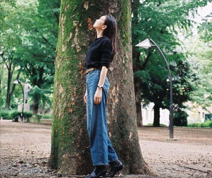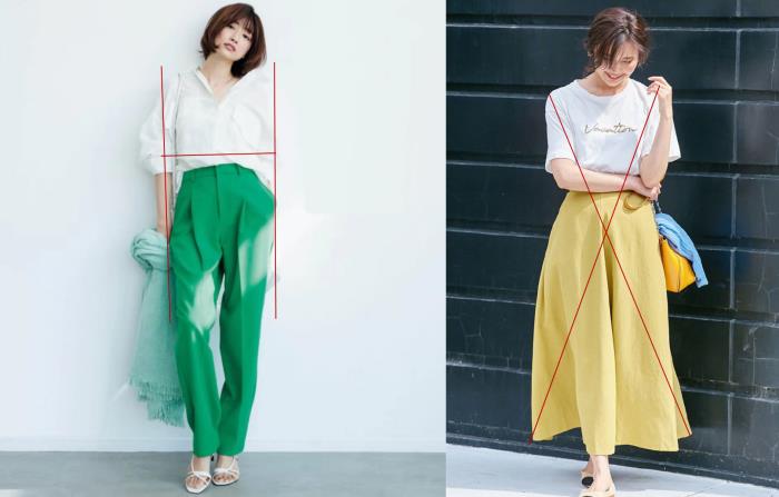 上衣宽松时,下装就要收缩,避免横向膨胀是原则。不管是裤子、或是裙子,都要保持垂度和小量感。像利落的直筒裤、小脚裤、直筒裙都是首选推荐。