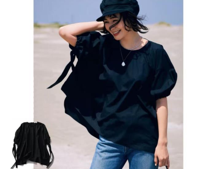 短袖,也同样有下收口的小量感灯笼袖。微微膨胀出的袖型与宽松的衣身,与自然露出的手臂形成量感对比,视感既清凉又显瘦。