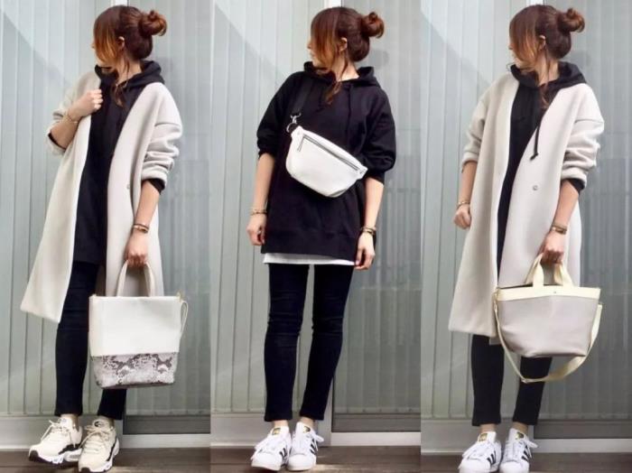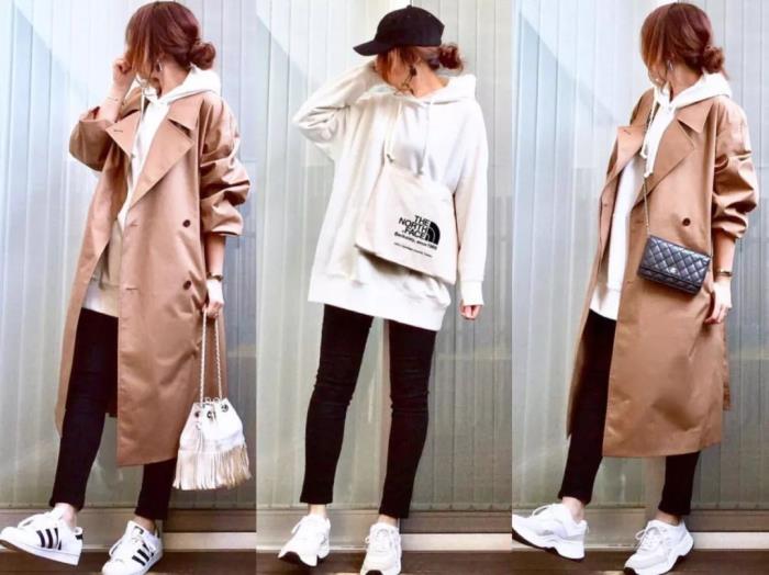 再来看看这套风衣搭配,相比于大衣,风衣更加适合这个季节,既有很好的御寒效果,又不会太过臃肿,冷暖适中,最重要的是遮肉,当然,对于微胖的人来说,大部分的脂肪都是堆积在腰部,所以上半身遮肉下半身显瘦这个技巧掌握好了,基本你就立于不败之地了,选择oversized风格的白色连帽卫衣+黑色铅笔裤,再搭配一双白色运动鞋上下呼应,时尚个性又能遮肉显瘦