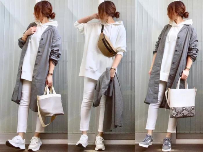 当然,也可以穿白色的铅笔裤,虽然小黑裤更加显瘦,但是有了同色卫衣加持,内搭上下同色,再搭配一件颜色稍深一点的薄款风衣,不说能然你看起来多显瘦,但至少能完美遮住你的小肚腩不是吗
