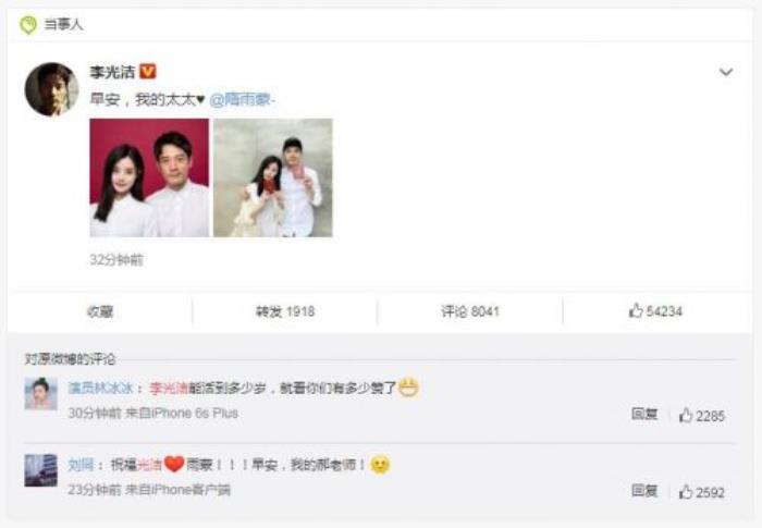 2019年7月3日上午,@ 李光洁晒出结婚证件照宣布结婚喜讯,并配文写道:“早安,我的太太,@ 隋雨蒙-。”照片中,李光洁和新婚妻子拿着结婚证合影,他霸气搂着老婆的肩膀,十分甜蜜。李光洁此前曾与郝蕾有过一段婚姻,之前,他与隋雨蒙多次被拍到同框、约会、见家长。恭喜!
