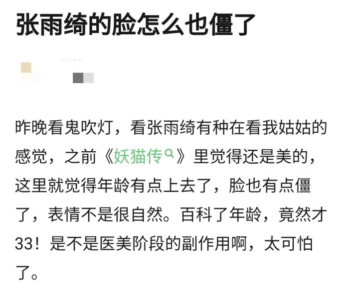 其实,这已经不是张雨绮第一次被质疑整容了。早在4月份《鬼吹灯》播出的时候,就有网友发现张雨绮的脸部有些僵硬,演戏时表情不是很自然,和之前在《妖猫传》当中的扮相有很大差距,疑似是出现了医美阶段的副作用。