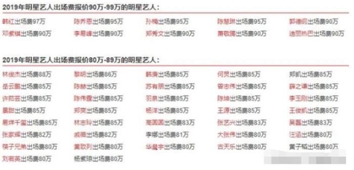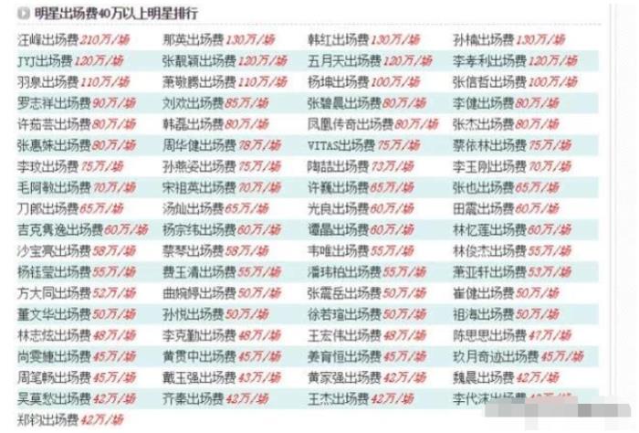 第二张图片看起来就是随着人气以及当下市场的变动,价钱也会有小浮动的增加或者减少,而且大多数歌手的出场费也就是一首歌或者两首歌,而演员的出场费也就基本上说几句话站一会就够了。而这几张图片上的就是一些有代表作的歌手或者演员了。