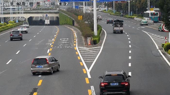 3月4日下午4时许,一辆浙JE××A7号本田小车来到这个路段,司机看到下穿隧道没车,放慢车速犹豫一会,压着导流线进入下穿隧道。▼
