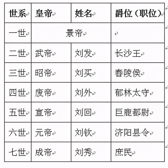 刘秀的六世祖长沙定王刘发,高祖父舂陵节侯刘买以及曾祖父郁林太守刘外都不是嫡长子,所以不能继承王位或者帝位,汉景帝有14个儿子,最早的太子是刘荣,后来被废除,改立第10个儿子刘彻为太子,这就是后来的汉武帝,如果刘发是嫡长子,那刘发就是皇帝的继承人,正因为他不是,所以只能封王。