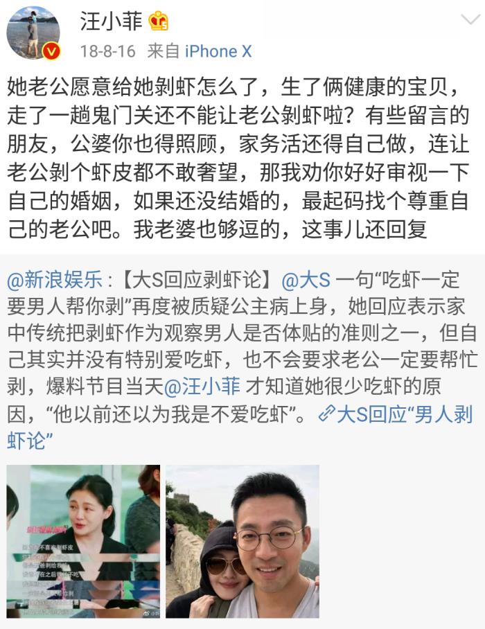 这段剥虾说还引发了大S和张雨绮的隔空battle。大S的态度是:“我从小吃虾都是爸爸剥,爸爸不在就不吃了。嫁给我老公字后,如果他剥,我就吃”。