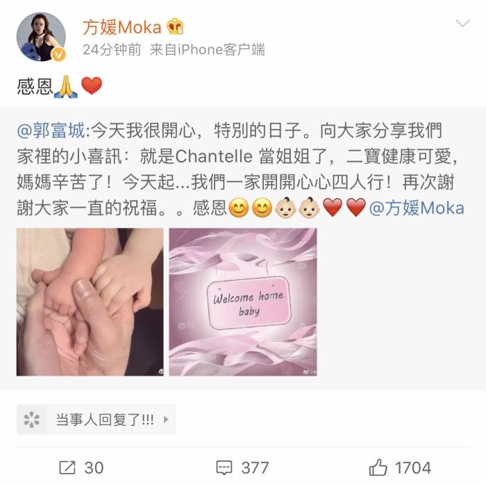 4月18日晚,郭富城在微博宣布老婆方媛已经顺利诞下二胎的消息,也表达了家里再添一名新成员的喜悦。