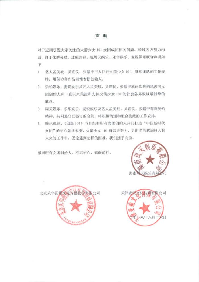 三方联合声明中称,孟美岐、吴宣仪、张紫宁三人回归火箭少女101,将继续团队的工作安排,用努力和作品回馈女团创始人。还向公众致歉,“就此次解约风波向女团创始人和一直以来关注和支持火箭少女101的社会各界致以最诚挚的歉意。”